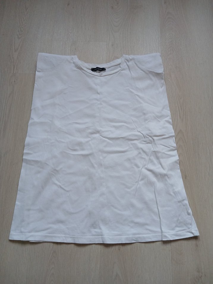 Beyaz, salaş kesim tişört, minimalist ve normal boyda. Rahat ve sade tasarım. Vatkali
