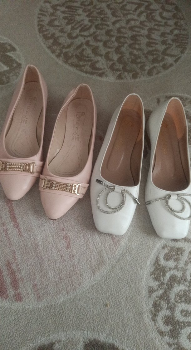 Beyaz ve pastel pembe renklerde, tokalı, blok topuklu kadın babetleri. Modern klasik tarzda, düz yüzeye sahip, günlük kullanıma uygun.