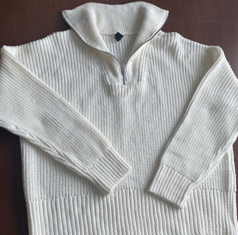 Yarım fermuarlı yüksek yakalı, uzun kollu, kadın beyaz kazak. Rahat ve sade görünümüyle günlük kullanıma uygundur.,krem rengi