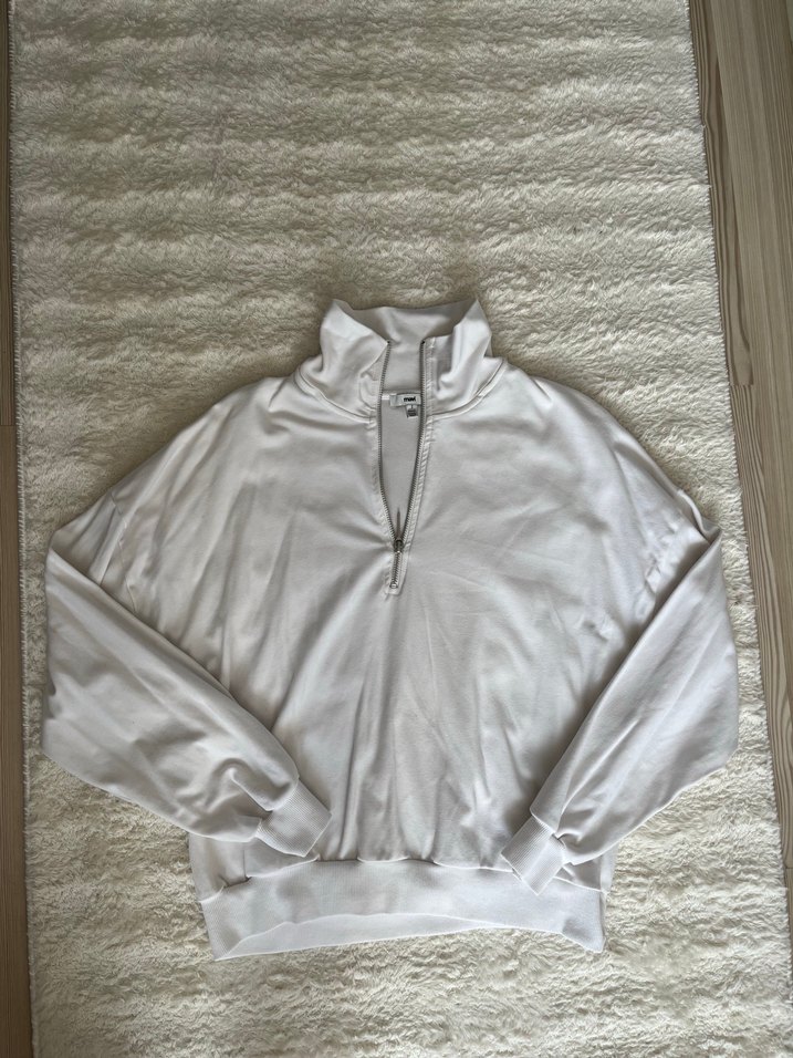 Kadınlar için yüksek yakalı, fermuarlı, uzun kollu ve bol kesim bir sweatshirt. Yumuşak ve sıcak kumaştan üretilmiştir, sade beyaz tasarıma sahiptir.