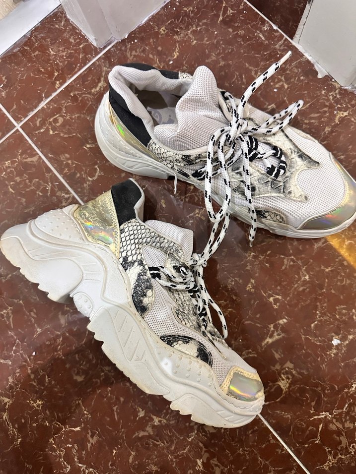 Metalik yerlerinde soyulma var onun dışında temiz Yılan derisi desenli beyaz platform topuklu, bağcıklı spor ayakkabılar. Kauçuk malzemeden, trend sokak giyimi ve athleisure tarzını birleştirir.