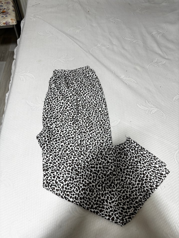 Kadınlar için beyaz kumaş pantolon, koyu yılan deseni, piliseli ve bol kesim. Minimalist sokak stili, günlük kullanıma uygun.