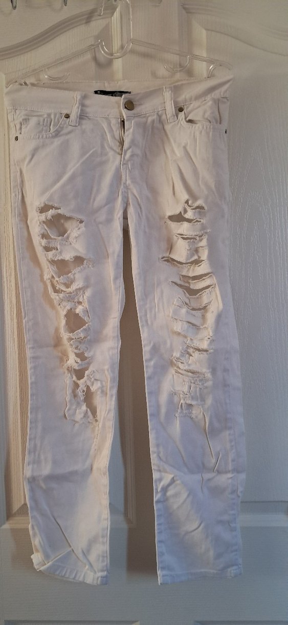 Gevşek kesim, beyaz denim kot pantolon, yırtık detaylı ve tokalı, günlük kullanım ve sokak stili için uygundur. ✨