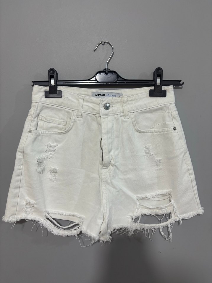 Yırtık detaylı, salaş kesim beyaz mini denim şort. Günlük rahat ve trend sokak stiline uygun.