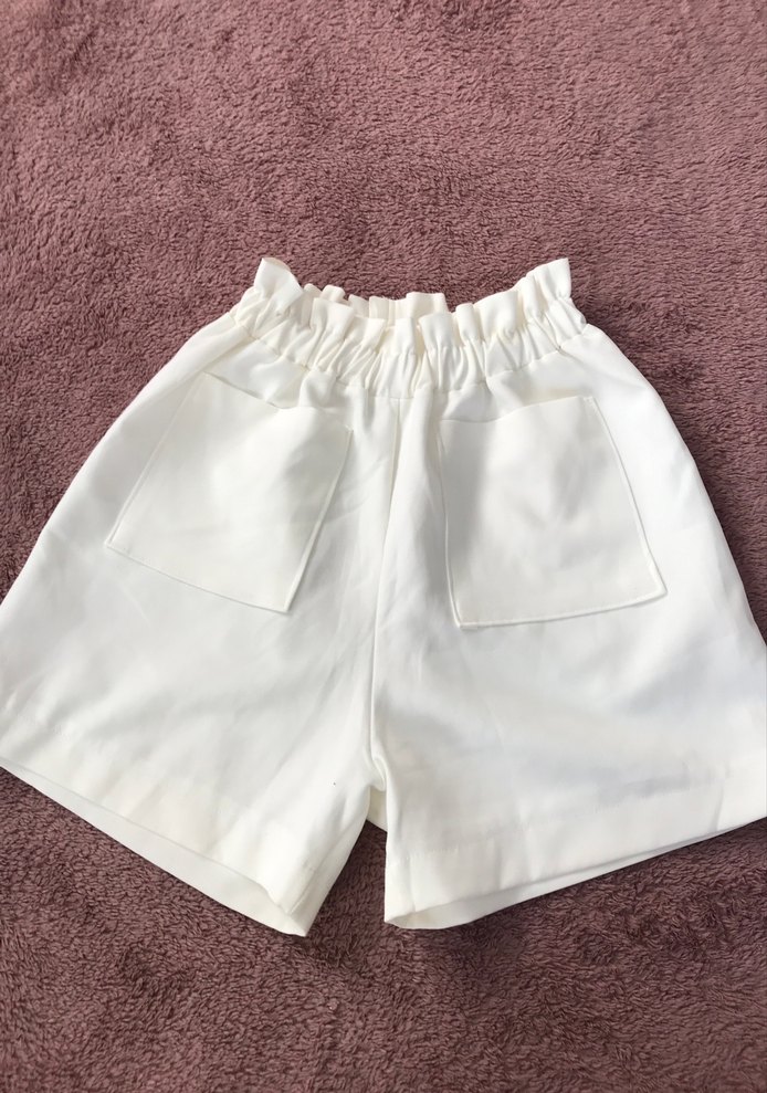 Beyaz yüksek bel mini şortlar, ön cepler ve bol kesimiyle günlük sokak stiline uygun, ipeksi dokulu.