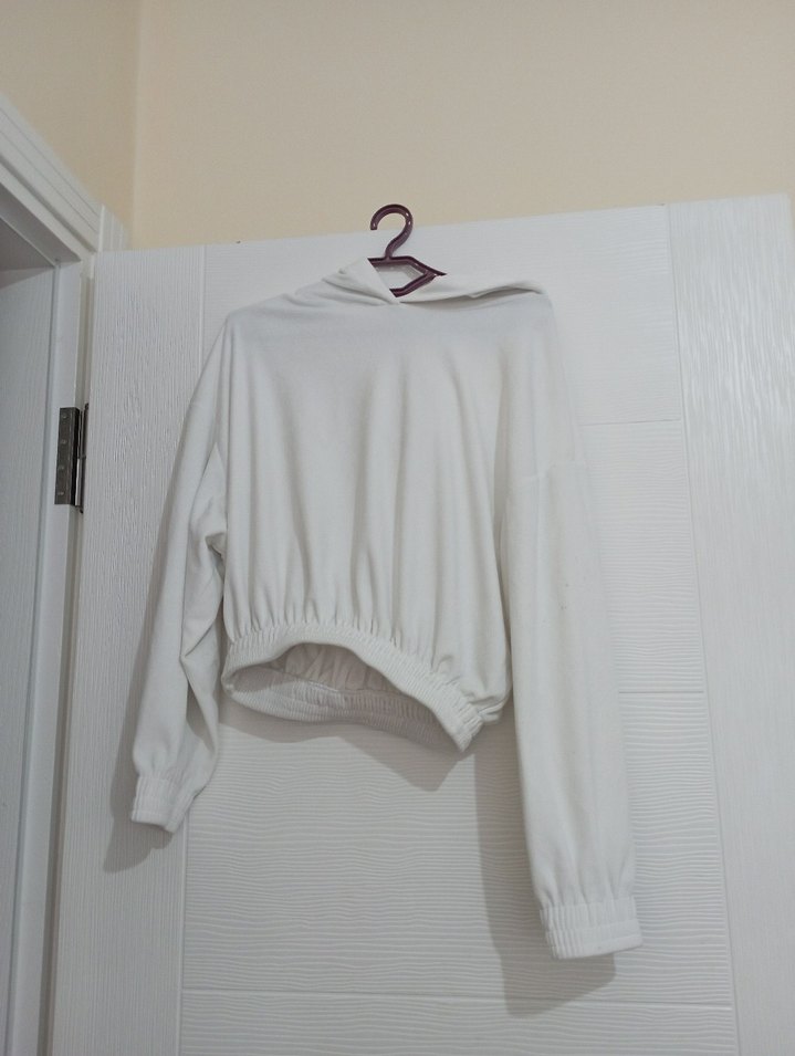 Kadınlar için beyaz renkte, yüksek yakalı ve uzun kollu, rahat kesimli keten kumaştan sweatshirt. Minimalist ve günlük kullanıma uygun. ufak tefek lekesi vardır