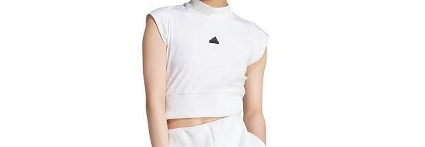Bu kadın beyaz crop top, yüksek yakalı ve kısa kollu, pamuklu kumaştan yapılmış, vücuda oturan kısa uzunlukta tasarlanmıştır. Şık ve sportif bir sokak giyim görünümü sunar. ♀️