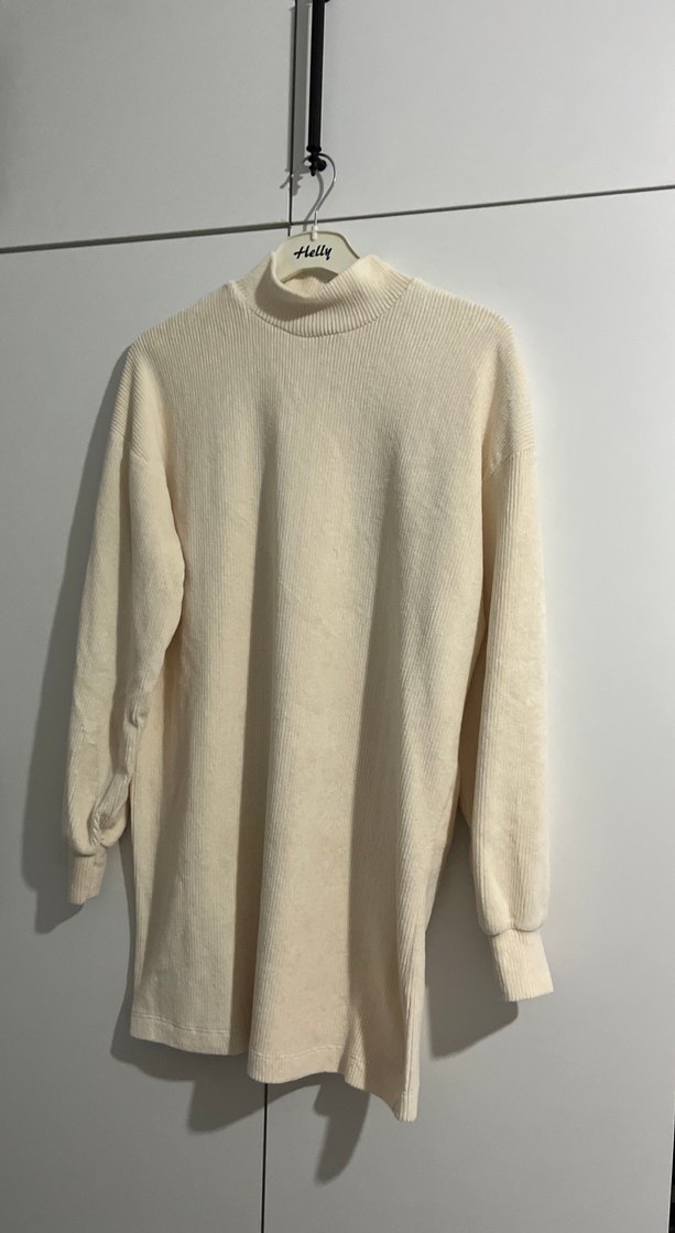 Beyaz, yüksek yakalı ve uzun kollu, yumuşak ve sıcak dokulu triko kazak. Bol kesim ve midi boyda, rahat günlük kullanım için uygundur. Düz, temel normcore tarzında.