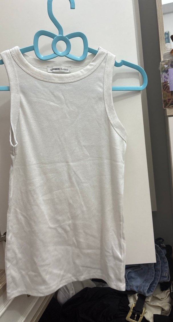Kadın beyaz, yüksek yakalı, pamuklu ve vücudu saran kesime sahip minimal ve sokak modasına uygun atlet. Günlük kullanıma uygundur.