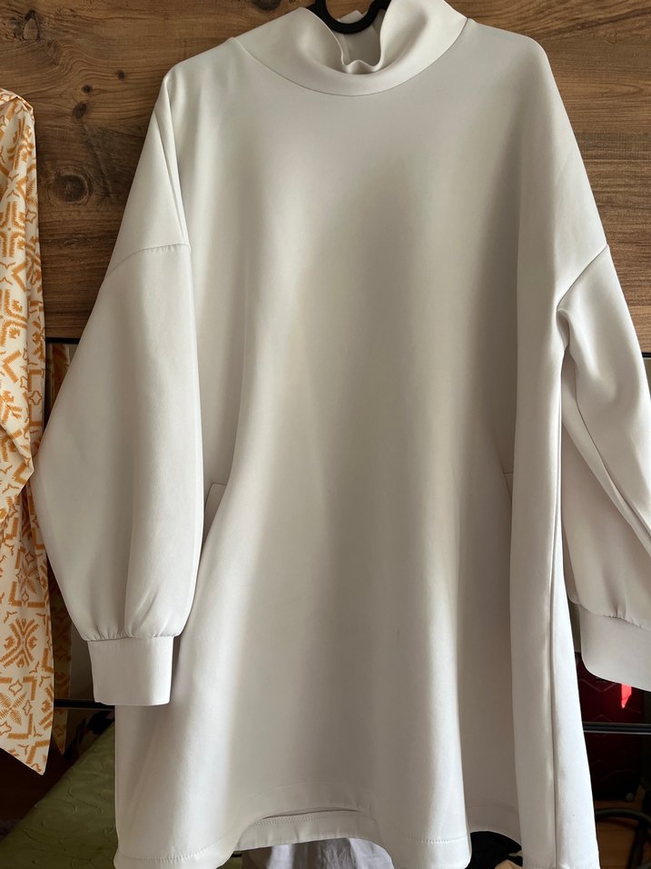Kadınlar için yüksek yakalı, uzun kollu ve bol kesimli beyaz tunik. Yumuşak sentetik kumaştan üretilmiş, günlük kullanım için uygundur.