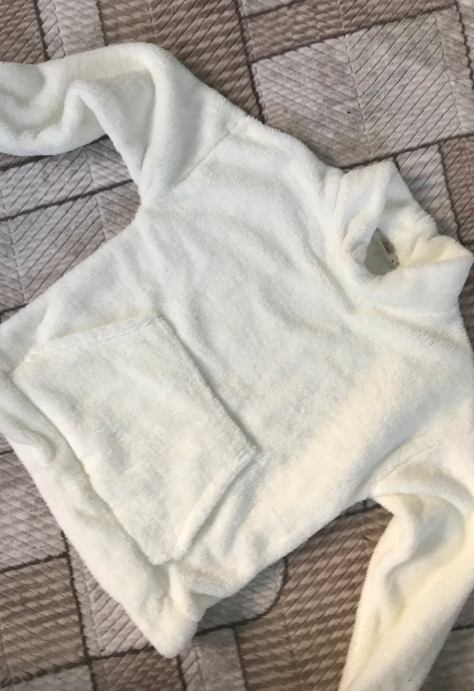 Kadın beyaz peluş sweatshirt, yüksek yakalı ve uzun kolludur. Bol kesim, yumuşak kürk detaylıdır ve ön ceplidir. Günlük kullanıma uygundur.