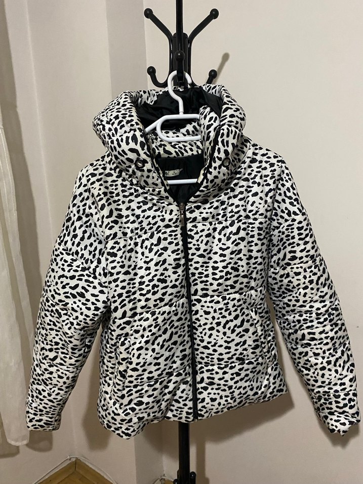 Kadın Beyaz Zebra Desenli Kapüşonlu Mont