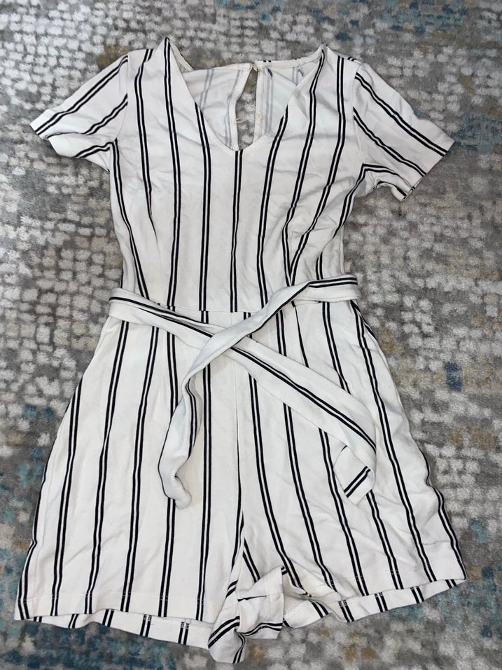 Kadınlar için beyaz ve gri zebra desenli, kısa kollu, V yakalı, kemerli ve vücuda oturan kısa tulum. Günlük kullanıma uygun sentetik kumaştan yapılmıştır.
