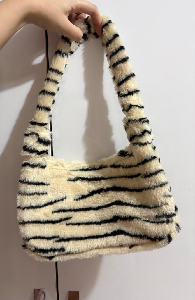 Kadın çantası, zebra desenli ve kürklü detaylı sentetik kumaştan yapılmıştır. Sokak stili ve bohem havasıyla günlük kullanıma uygundur.