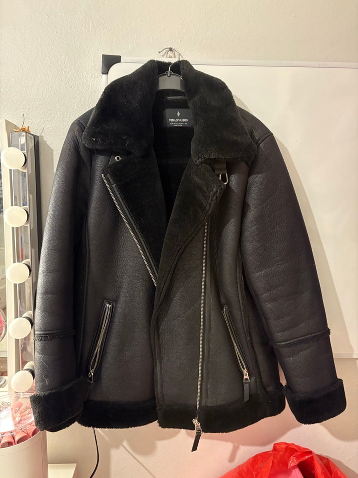 Siyah biker ceket, fitted kesim, yaka ve kürk detaylıdır. Normal boyda, trend günlük kullanım için uygundur. Az kullanıldı