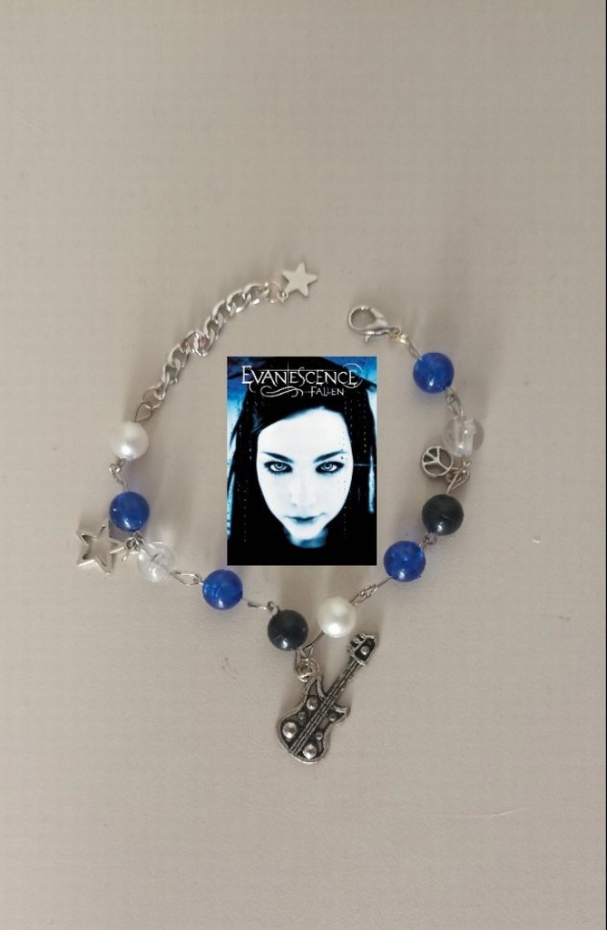 Koyu mavi boncuklu, gotik tarzda yıldız, barış sembollü ve gitar figürlü kadın bileklik. Parti ve rock punk tarzına uygun.