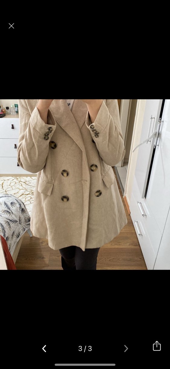1.70 boy 60 kilo ile giydim Bej keten kumaştan, düğmeli ve kruvaze yaka detaylı uzun kollu, salaş kesim midi kadın ceket.