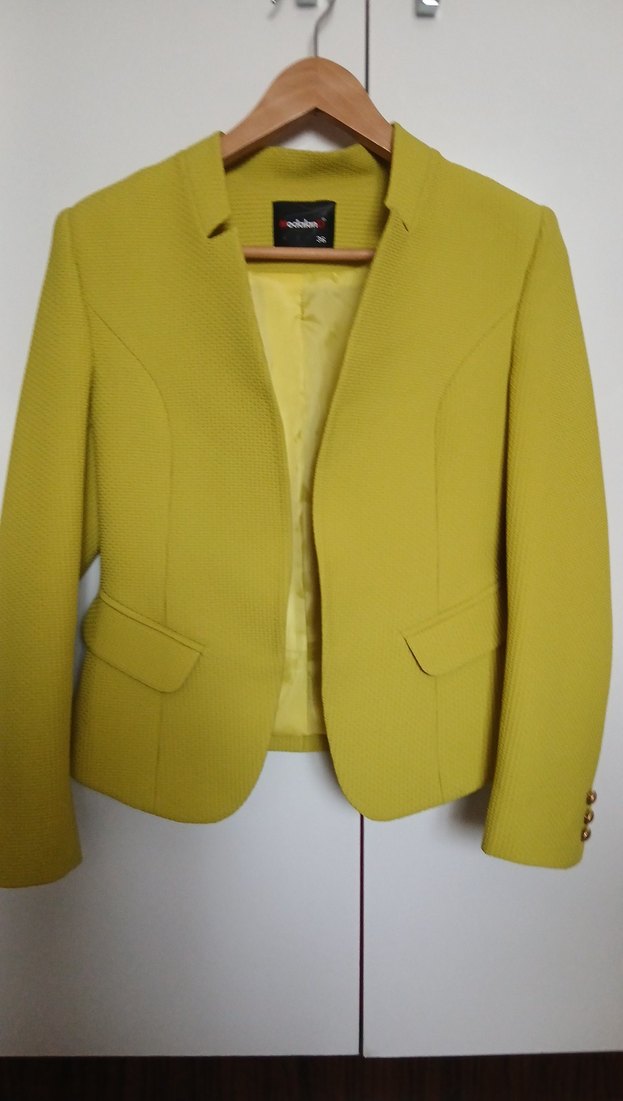 Açık yeşil,sarı renk düğmeli kadın blazer ceket. Notlu yaka, uzun kollu ve midi boyda, modern klasik, ofis ve günlük tarzına uygun.