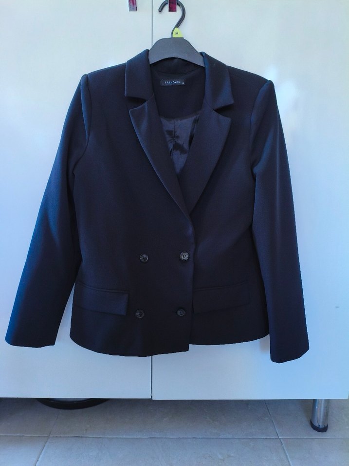 siyah renkli, düğmeli önü ve klasik yaka detaylı kadın blazer ceket. Uzun kollu ve ipeksi dokulu, ofis için uygun. Hiç bir problemi yıpranması deformasyonu yoktur.Tertemiz ve pırıl pırıldır.