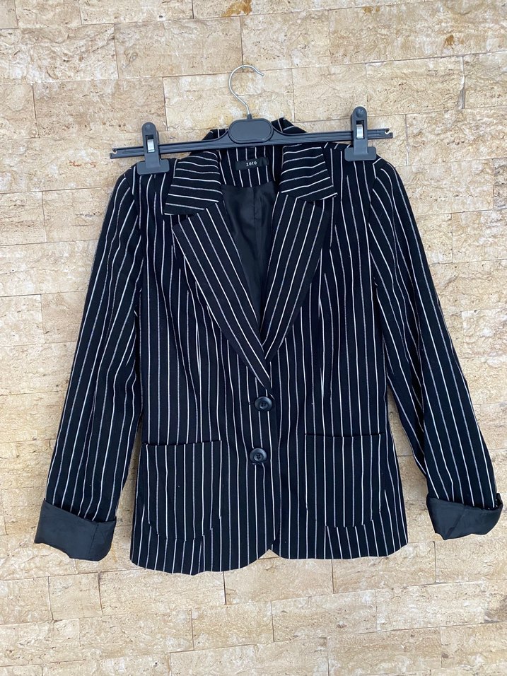 Uzun kollu, siyah beyaz çizgili mini blazer sorunsuz, marka temsili