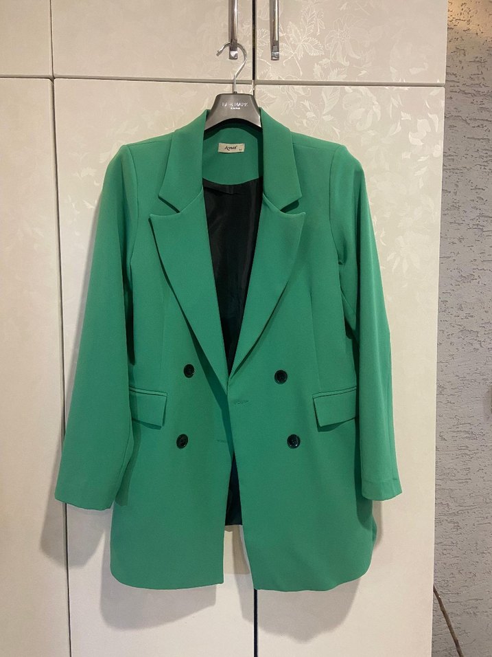Düğmeli, uzun yeşil kadın blazer ceket, keskin yaka ve regular fit ile ofis şıklığı sunar. Uzun kollu, düz ve sentetik kumaştan üretilmiştir.