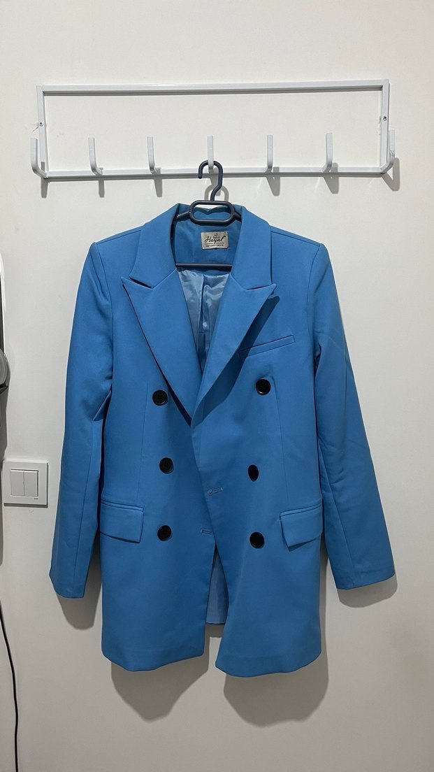Mavi kadın blazer ceket, düğmeli ön kısmı ve kesik yaka detayı ile ofis kullanımı için uygundur. uzun kollu ve rahat kesimdir.Bir kaç kez giyildi
