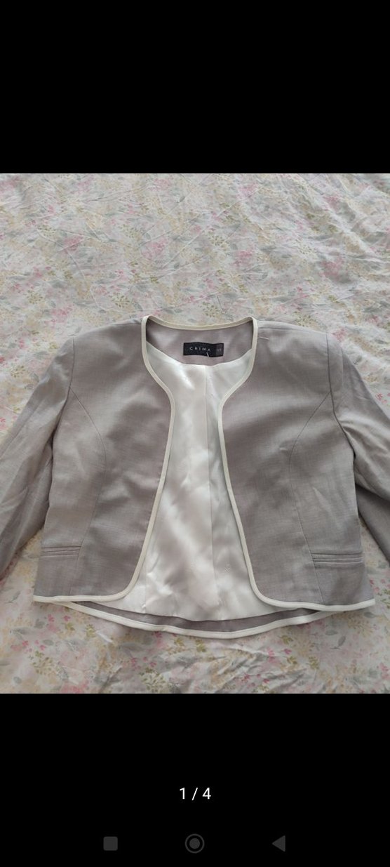 Gri renkli, keten kumaştan yapılmış, klasik kesim ve düğmeli, uzun kollu kadın blazer ceket. Modern klasik tarzda, ofis için uygundur. sifir ayarinda