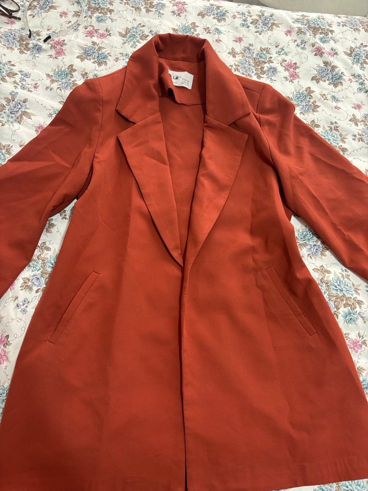 Kiremit renkli kadın blazer ceket, uzun kollu ve normal boydadır. İpeksi dokusu ve regular kesimiyle ofis ve günlük şıklık için uygundur. ✨
