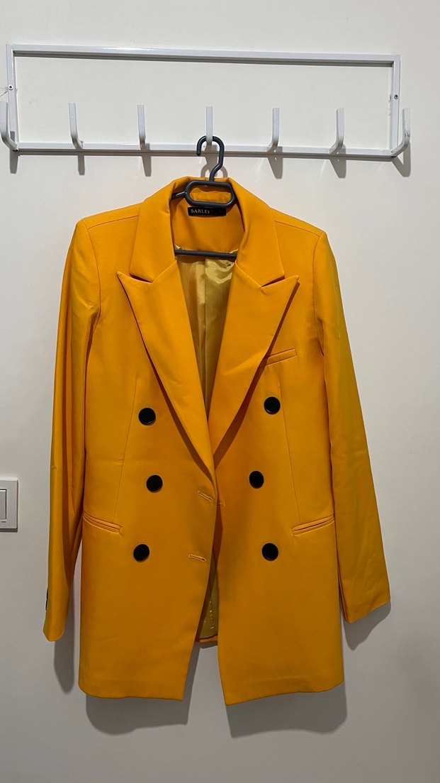 Sarı, düğmeli, klasik yaka ve regular fit kesime sahip, kadın blazer ceket. Yaka kısmında askı lekesi var kuru temizleme ike geçer