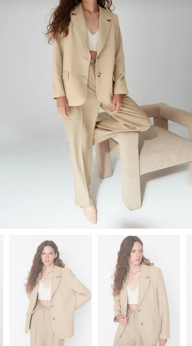 Bej renkte, normal kesim ve kesikli yaka detaylı kadın ofis blazeri. Uzun kollu, desensiz, sentetik kumaştan midi boyda, zahmetsiz şıklık sunar. Ürün neredeyse hiç kullanılmadı yepyeni