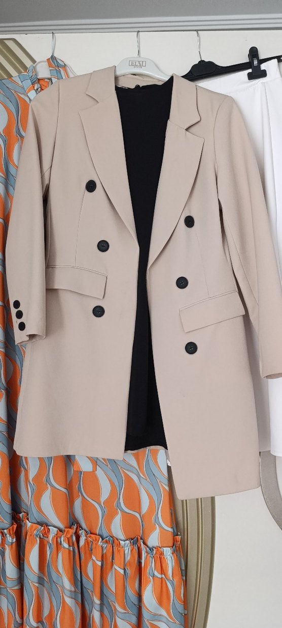 Bej renk, uzun kesim kadın blazer ceket, keskin yakalı ve düğmeli ön tasarıma sahiptir. Düz ve sentetik kumaştan üretilmiş, rahat kesimli ve uzun kolludur. Günlük kullanıma ve tesettür için uygundur. sadece bir kere giyildi. içlik dahil fiyat