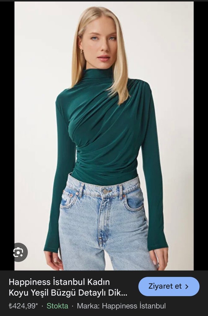 Koyu yeşil renkte, büzgü detaylı, yüksek yakalı ve uzun kollu, normal boyda, hafif desenli denim bluz. Günlük ve sokak stiline uygundur. Yenisen farkı yok sayılı giyildi