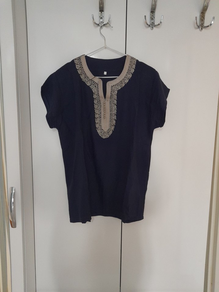 L beden, işlemeli yaka. Lacivert renk. Dar kalıp. Göğüs genişliği 50 cm, uzunluk 60 cm, üst kol genişliği 25 cm, alt kol genişliği 20 cm.