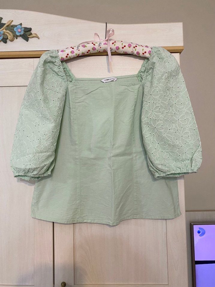 Lcw marka, balon kollu, su yeşili bluz. Kollarında minik çiçek işlemeleri vardır. Çok tatlı ve yaz için oldukça uygun bir üründür. Hiç kullanılmadı, sorunsuz. Koltukları 45, omuzdan boy 58 cm.