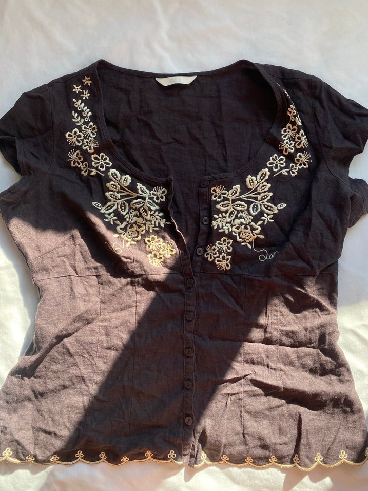 Kahverengi keten, nakışlı çiçek desenli, V yaka, düğmeli, kısa kollu, bol kesim bohem tarzda kadın bluz.