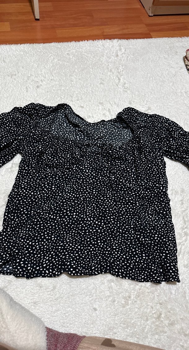 Siyah puantiyeli, uzun kollu ve V yakalı bol kesim bluz. Fırfır detayları ve midi boyu ile yumuşak sentetik kumaştan üretilmiştir. Casual sokak stili için uygundur.