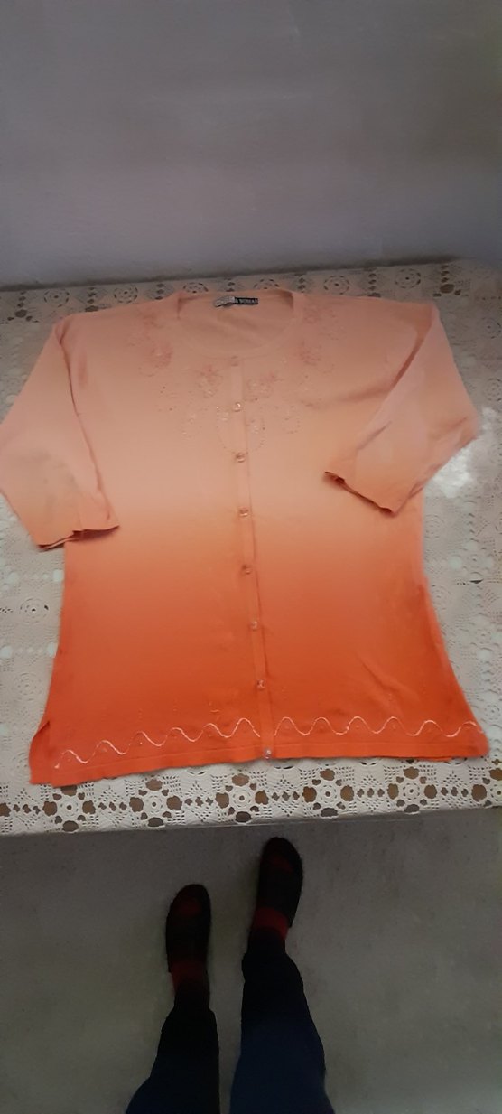 Kadınlar için fakir kollu, düğmeli,boncuk islemeli bluz.merserize kumaştan yapılmış, pastel bejden turuncuya geçişli, vintage bohem tarzda. tertemiz