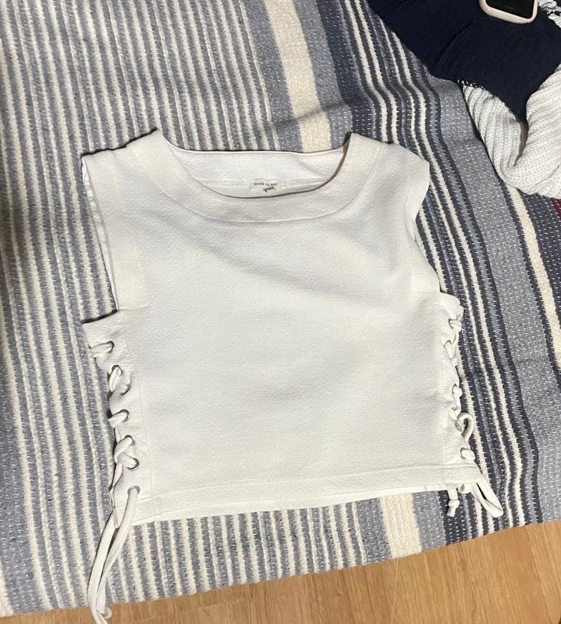 Beyaz kolsuz triko bluz, balıkçı yaka ve vücuda oturan kesime sahiptir. Yumuşak pamuktan yapılmış, yanlarda bağcıklı detaylar bulunur, günlük sokak stiline uygundur.