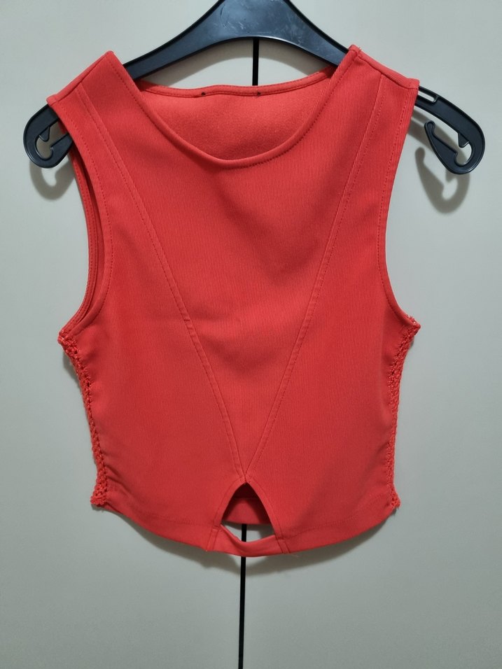 Mavi marka, s beden, vücuda yapışan kolsuz bluz.Üstte çok şık ve kaliteli duruyor. Nar çiçeği rengindedir.