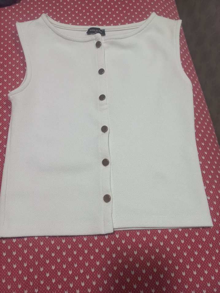 kadın bluz dugme detayli ama dugmelerin bikac tanesi dijildi kapatildi gogus kismindaki yuvarlak yakalı, pamuklu kolsuz yelek. Düz ve rahat kesim, sokak stili için uygun.