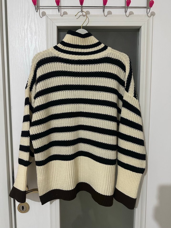 Boğazlı, uzun kollu, bol kesim çizgili triko kazak. Koyu kahverengi ve krem renklerde, rahat ve sıcak bir sokak giyimi parçası.