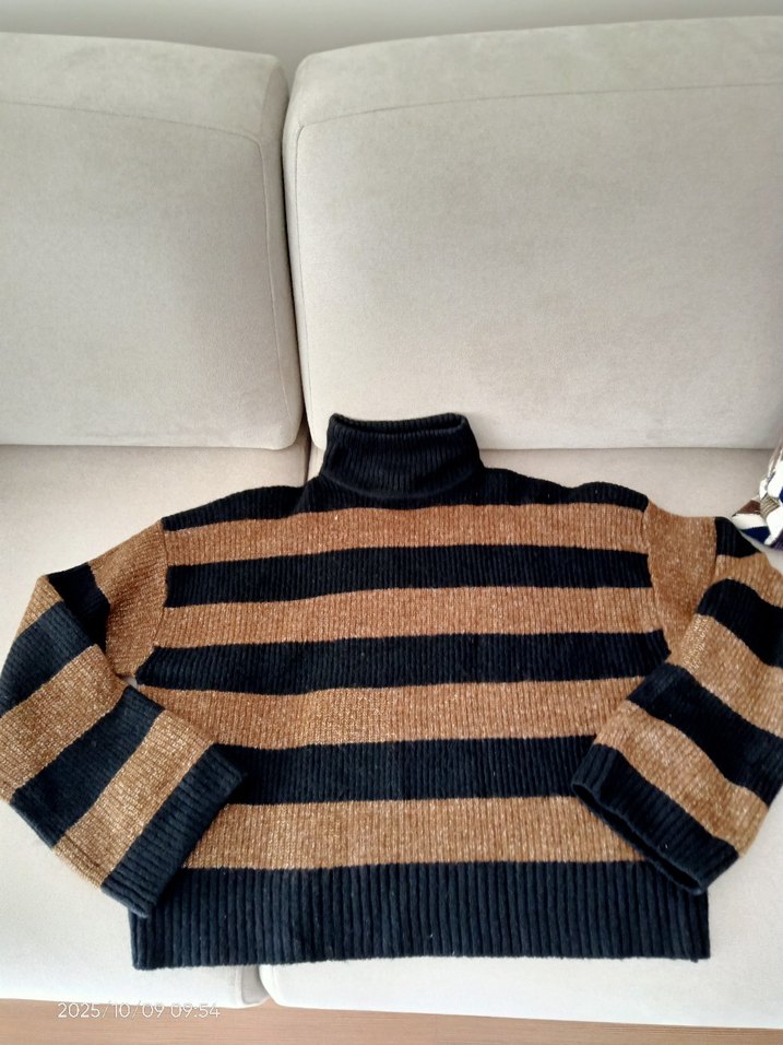 Kadın boğazlı, uzun kollu ve bol kesim çizgili triko kazak. Koyu kahverengi ve siyah renklerde, günlük rahat kullanım için uygun. Sadece 1 kez giydim.yepyeni.M bedenede uygun.tüylenme sorunu yoktur.