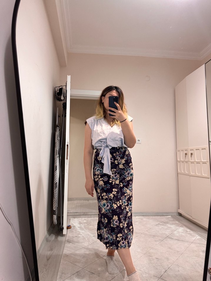 Takım halinde.isteyen ayrıda alabilir Kadınlar için pamuklu, bol kesim midi etek. Hafif renklerde bohem çiçek deseniyle rahat ve şık bir görünüm sunar.