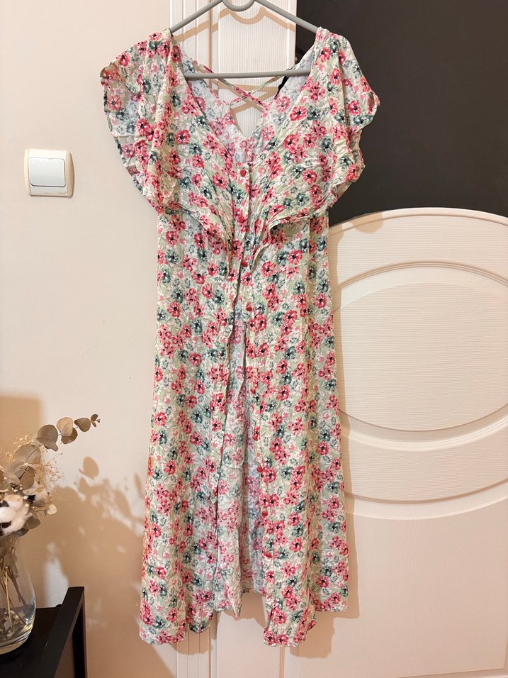V yaka, kolsuz, bol kesim, pastel çok renkli çiçek desenli, fırfırlı bohem tarzda uzun elbise. Sentetik kumaştan üretilmiştir. 2 kere giyildi.