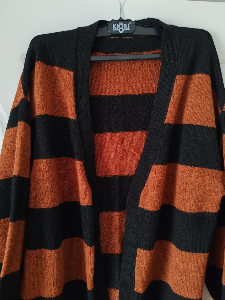 Kadınlar için uzun, bol kesim ve uzun kollu, tekne yakalı yün hırka. Kahverengi ve siyah çizgili, bohem tarzda rahat bir tasarım. 0 ürün hiç kullanılmadı.