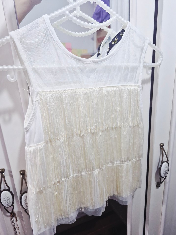 Kolsuz, dantel ve nakış detaylı beyaz bluz, bol kesim ve yuvarlak yaka ile bohem parti tarzına uygun.