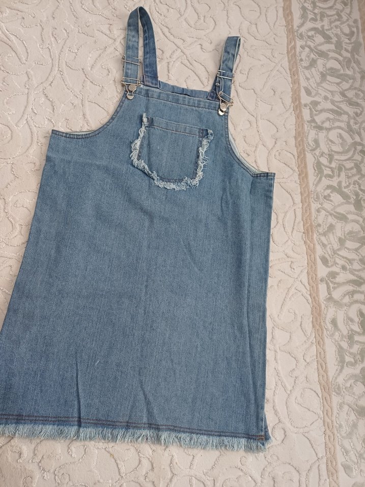 Mavi renkli, cep ve püskül detaylı, salaş kesimden oluşan, günlük kullanıma uygun, kot midi salopet.