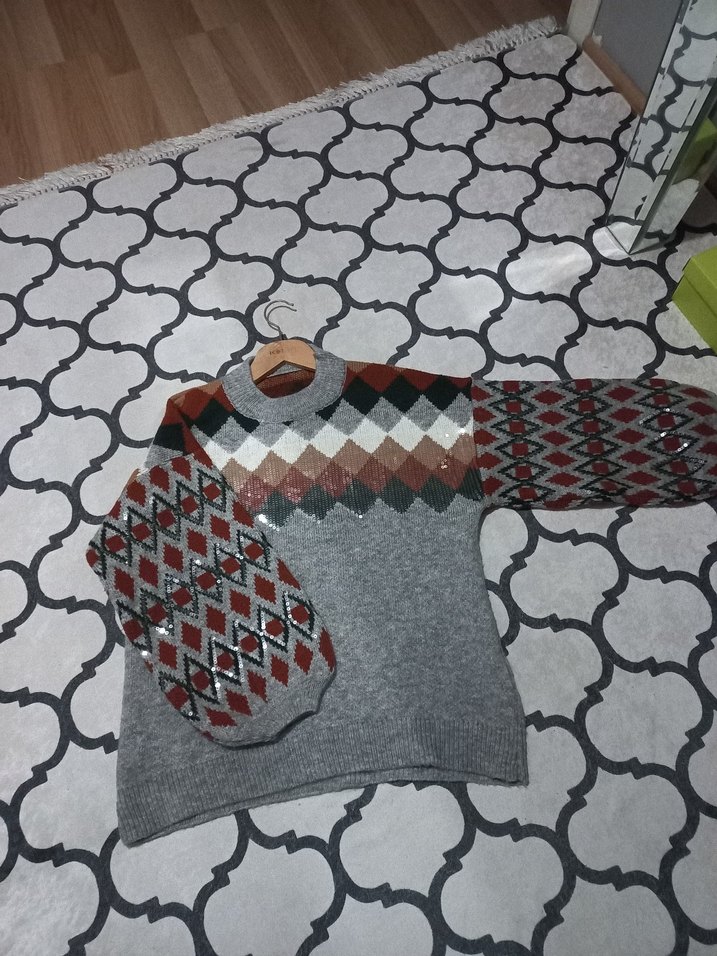 Gri renkli,bisiklet yaka ve uzun kollu, desenli örme triko kazak. Bol kesim ve kısa boy ile rahat ve bohem tarzı bir arada sunar.