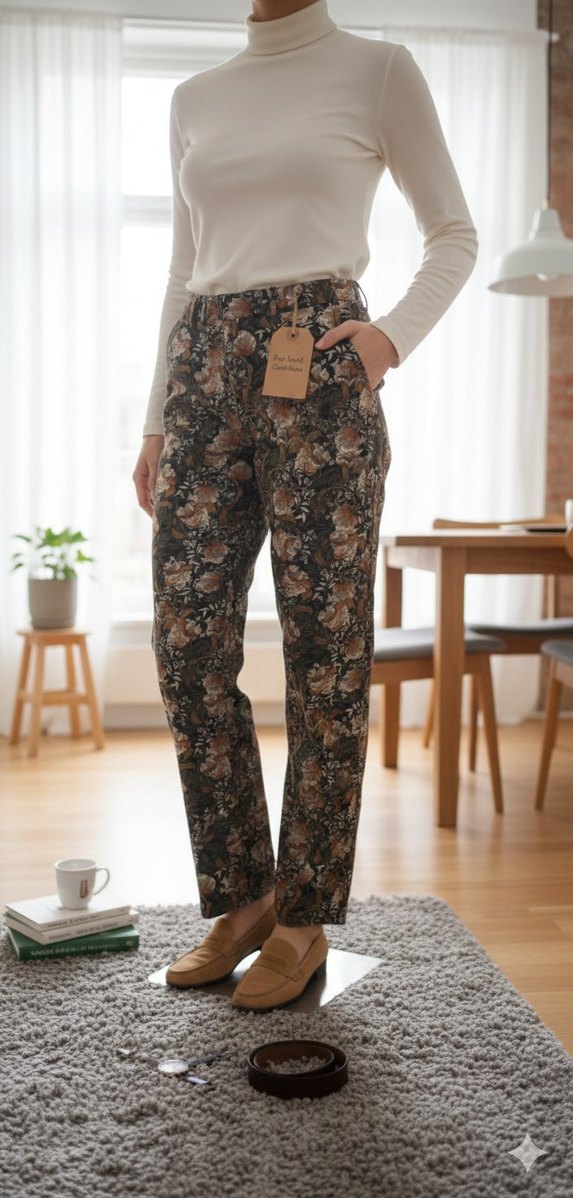 Kadınlar için bol kesim, koyu kahverengi bohem çiçek desenli ve dantel detaylı midi uzunlukta kumaş pantolon. Günlük kullanım için uygun. Paça boyu 99 cm paça genişliği 23 cm bel 36 cmdir.
