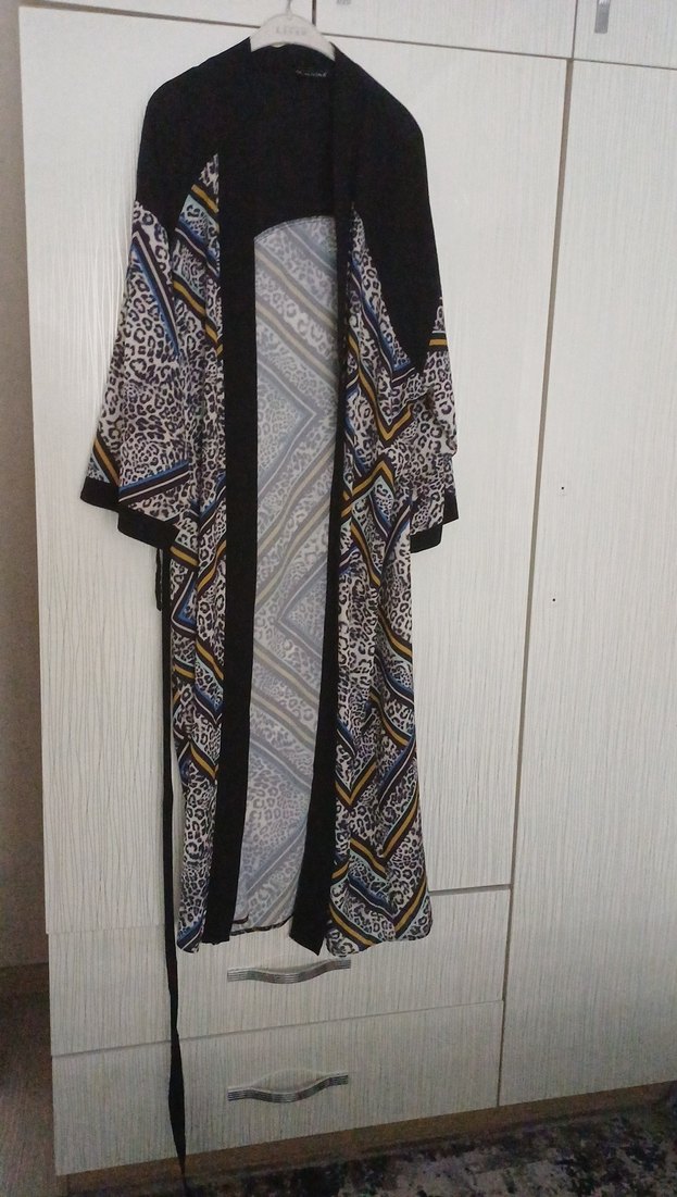 Kadınlar için uzun, dökümlü ve bol kesim kimono. Askılı kolsuz yakası ve koyu çok renkli bohem desenlidir. Sentetik kumaştan, günlük kullanım için uygundur.